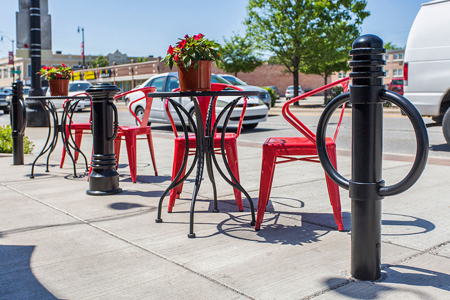 The R-7905 post & ring bike bollard provides multi-purpose security. Functioning as a bollard when not in use, the rings double as secure 2-point-contact bike parking for up to two bicycles at a time. Made from steel and powder coated to prevent rust.