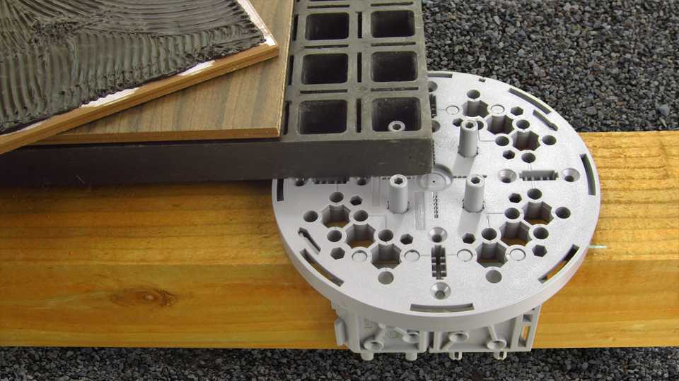 ODF Inc. manufactures and distributes an Outdoor Floor System® for exterior decks and rooftop terraces including GRATEDEX® and elePHOOT®. Both flooring systems consist of modular components along with fasteners connectors adhesives pedestals and other parts that provide a more durable method for placing thin gauged stone or tile in an exterior flooring application without the use of cement-based mortars grouts or adhesives. This flooring technology creates a lightweight stone floor over traditional joist framing a waterproof rooftop or even on grade. In addition to thin gauged stone or tile these flooring systems also support the placement of modular pavers in a dry-laid installation method without a mud set or sand bed. Use in all weather conditions and all temperatures for maximum durability and beauty. GRATEDEX® system is a best solution for all residential single-family and multifamily on any traditional exterior deck without reconstruction or as a floating floor over waterproofing. The elePHOOT® system and pedestal is a commercial or high-end residential for creating flat exterior rooftop terraces with a variety of surface finishes.