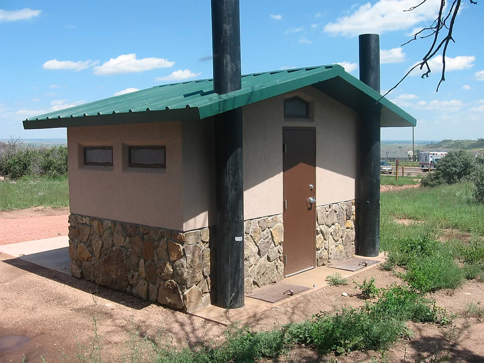 A vent pipe on the back of the structure faces south and when heated by the sun, generates a continual air flow through louvered vents located in the building near the floor. The positive continual air flow carries the vault air out through the vent pipe, not through the building, to keep the structure odor-free.