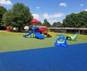 No Fault Safety Surface is the ideal rubber safety surface for playgrounds. This seamless, slip-resistant, and impact absorbing surface is a 2-layer system of SBR buffing, EPDM/TPV granules, and polyurethane binder. Poured onsite, the decorative wear layer can be installed in a variety of colors and patterns to match your theme.
